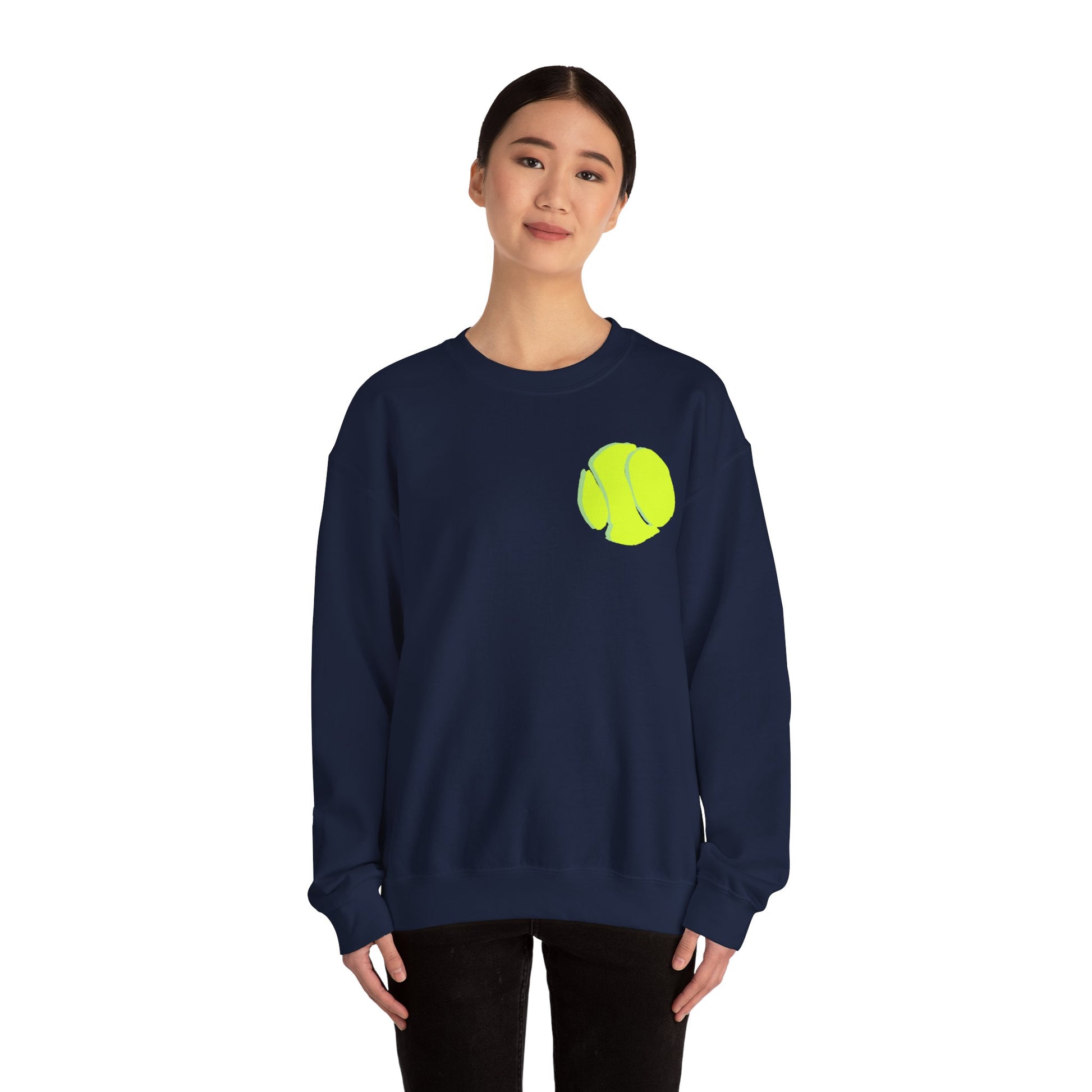 Introducing our Carrie Song Tennnis Ball Sweatshirt! Embrace your love for tennis with flair and art. Made with a medium-heavy fabric blend of 50% cotton and 50% polyester, this sweatshirt has a classic fit along with the crew neckline.