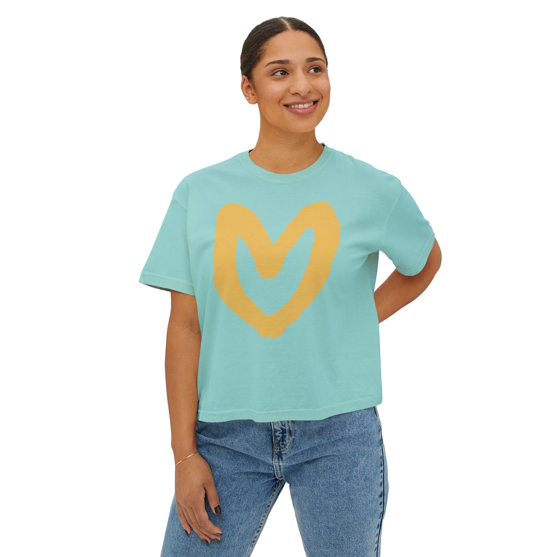 Introducing a Carrie Song Heart vibrant Boxy Tee that radiates comfort and style. This tee offers a trendy, laid-back look perfect for casual outings or lounging at home. Crafted from 100% ring-spun cotton, it feels soft against your skin while featuring a unique vintage appeal thanks to its pigment dye finish. The boxy fit adds a modern twist, making it perfect for women who cherish a relaxed yet chic wardrobe, whether for everyday wear or special occasions. Celebrate yourself or gift it to someone special.