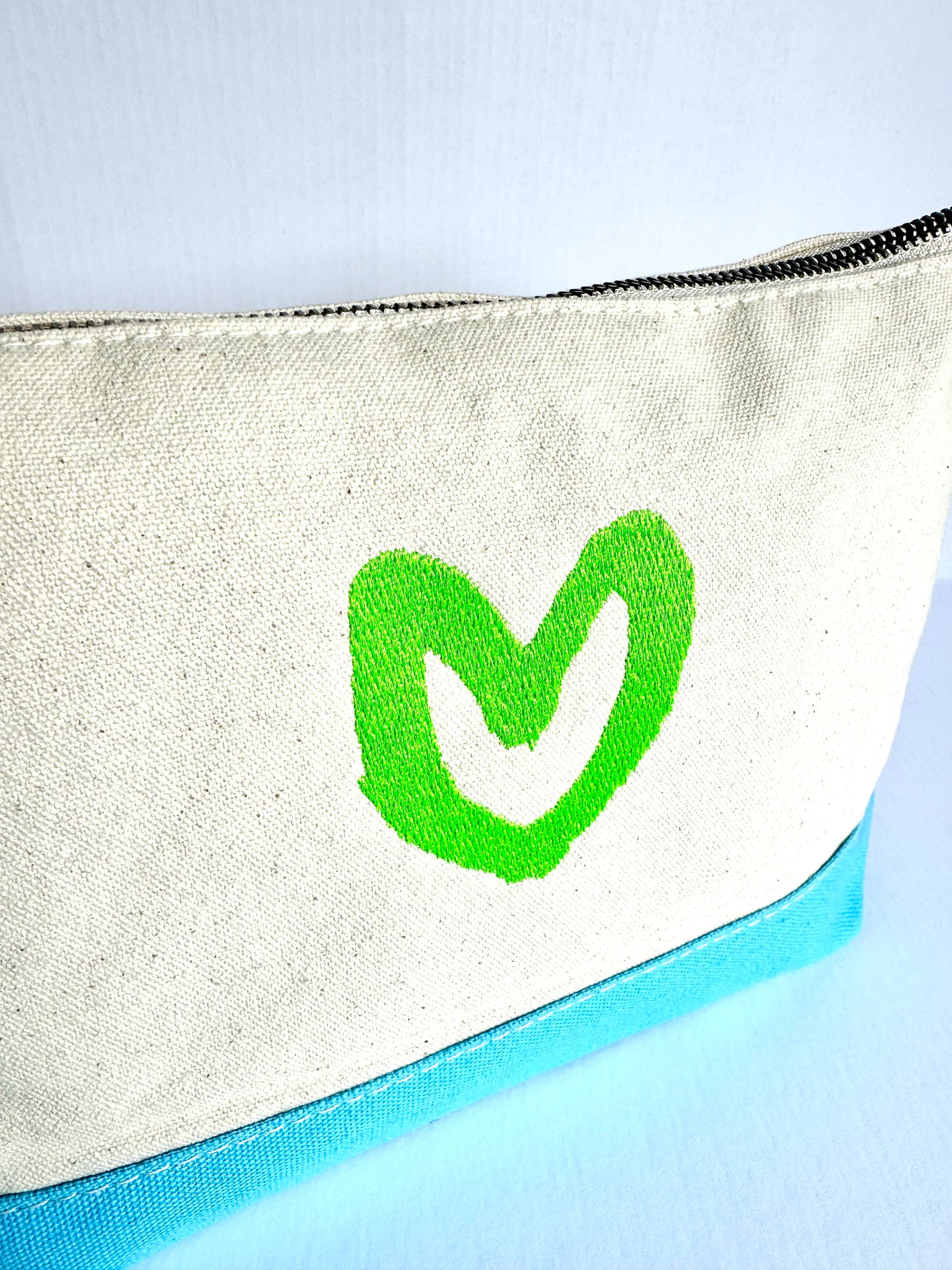 Get ready to fall in love with the newest piece in the Carrie Song x Taylor Monogram Collection! This canvas zipper pouch features a color block base and a signature Carrie Song heart embroidered by Allison at Taylor Monogram. Perfect for makeup, cosmetics, travel, school, gifts…