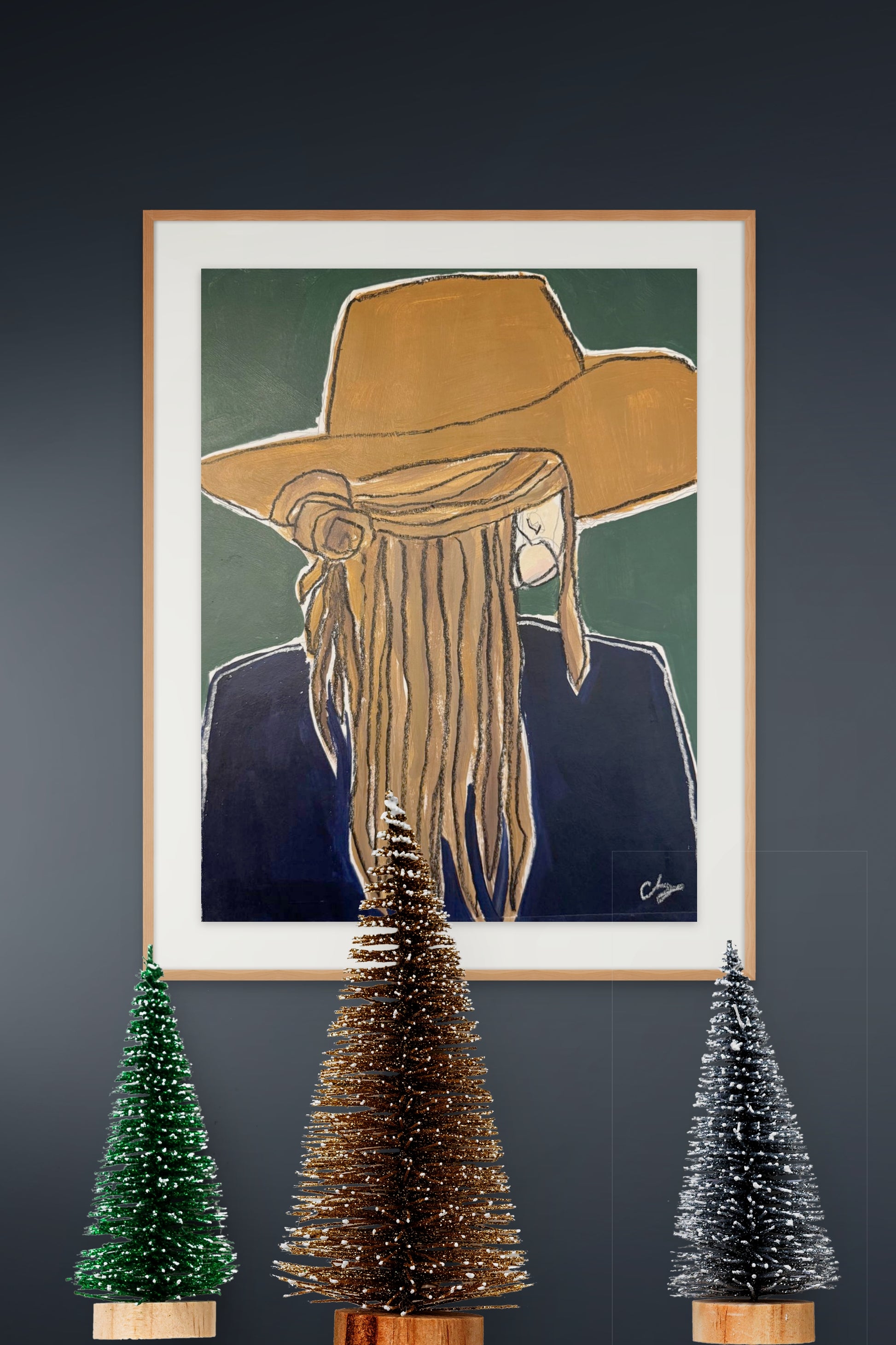 This cowgirl is all quiet confidence and steady ground. With her wide-brimmed hat pulled low and her long braid tied with intention, she’s a reminder that not every story needs an audience to be powerful. Strong lines, earthy greens, and grounded tones give this piece a calm, anchoring presence—perfect for a space that needs a little more resolve and a little less noise.