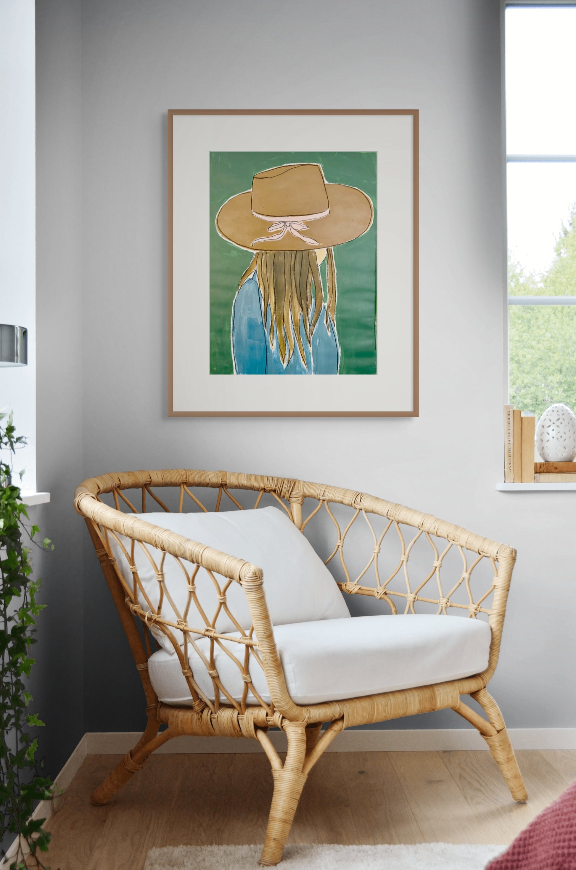This cowgirl is mid-exit—cool, composed, and already two steps ahead. With fluid lines and soft movement in the hair and hat, the painting captures that moment right after the decision is made. No drama. No explanation. Just forward motion.